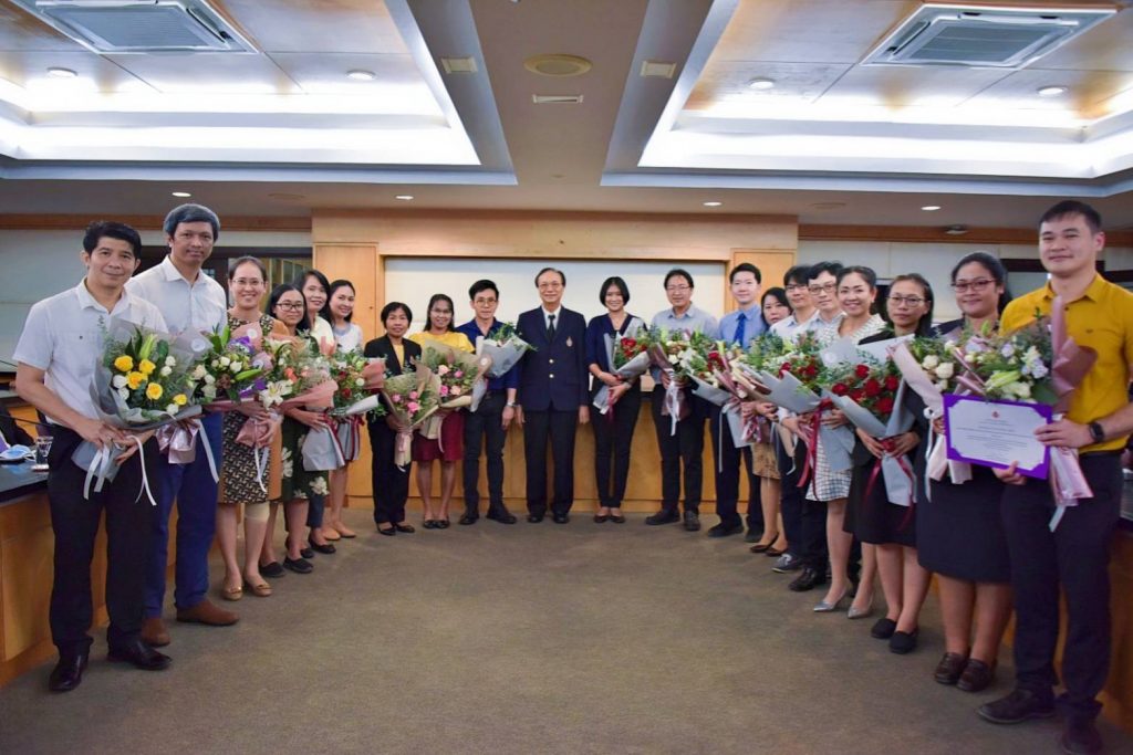 The President of Walailak University presents a trophy for outstanding research results. With a bouquet of flowers to congratulate To certified teachers teaching under the UKPSF framework
