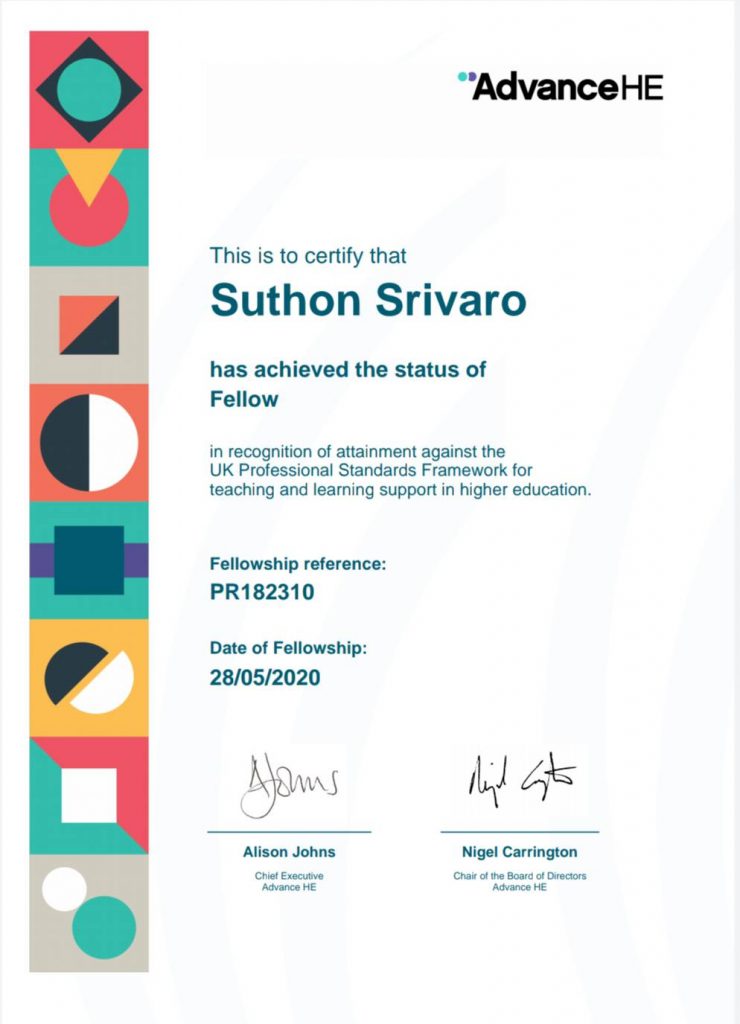 School of Engineering and Technology Congratulations to Associate Professor Dr. Suthon Sriwaro, Lecturer, Petrochemical and Polymer Program Which is part of Walailak University professors Which has passed the UKPSF training course, which has been certified as a Fellow in accordance with the standards of The United Kingdom Professional Standards Framework (UKPSF), England, is a teaching management system that meets international standards and is generally used in general. The UKPSF tertiary education has been developed by The Higher Education Academy (HEA) or Advance HE, currently a national independent body in the United Kingdom. Is a framework used by Walailak University to improve the quality of teachers to be professional teachers and provide quality education that meets international standards
