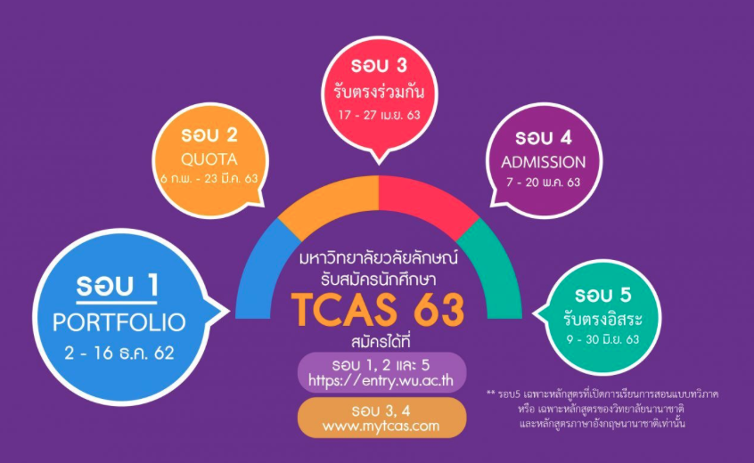 โดยมีกำหนดการคัดเลือก 5 รอบ TCAS63 ซึ่งรอบแรกเปิดรับสมัครวันที่ 2-16 ธันวาคม 2562 ในรูปแบบของ Portfolio และจะเปิดรับสมัครเรียนรอบที่ 2 วันที่ 6 กุมภาพันธ์ – 23 มีนาคม 2563 ซึ่งน้องๆสามารถติดตามข่าวสาร หรือดูข้อมูลเพิ่มเติมได้จาก เวปไซต์ https://entry.wu.ac.th/