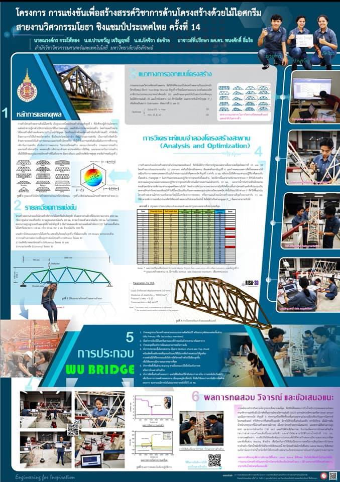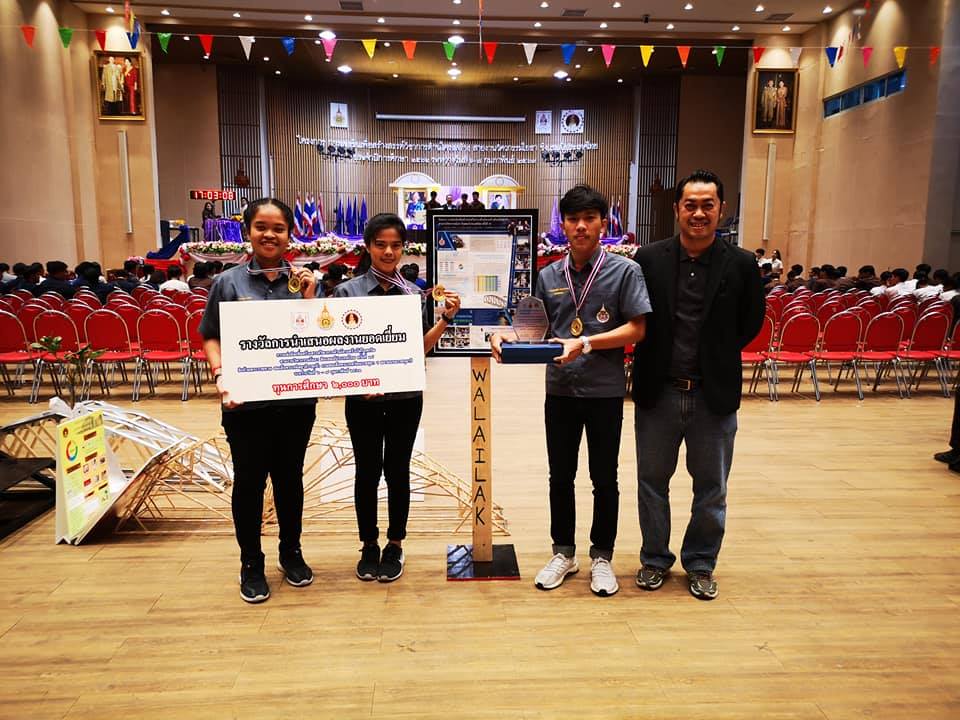 นักศึกษาสาขาวิชาวิศวกรรมโยธา สำนักวิชาวิศวกรรมศาสตร์และเทคโนโลยี มหาวิทยาลัยวลัยลักษณ์ สามารถคว้ารางวัลนำเสนอผลงานยอดเยี่ยม 1 รางวัล ในเวทีการแข่งขันวิชาการด้านโครงสร้างด้วยไม้ไอศกรีมสายงานวิศวกรรมโยธา ครั้งที่ 14 โดยมีสถาบันการศึกษากว่า 30 สถาบัน ทั่วประเทศ เข้าร่วมแข่งขัน ณ มหาวิทยาลัยเทคโนโลยีราชมงคลรัตนโกสินทร์ จ.นครปฐม เมื่อวันที่ 6 – 7 กุมภาพันธ์ 2563 ที่ผ่านมา