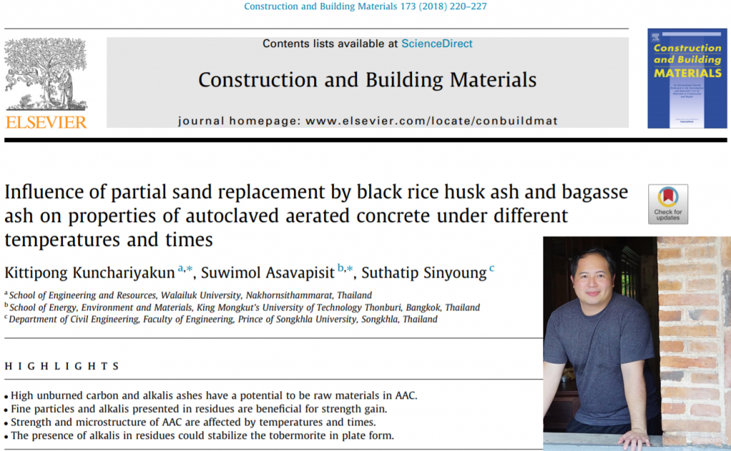 งานวิจัยเกี่ยวกับการนำของเสียได้แก่ เถ้าแกลบ และเถ้าชานอ้อย นำมาเป็นวัตถุดิบในการผลิตคอนกรีตมวลเบาอบไอน้ำ โดยผลจากงานวิจัยนี้สามารถนำไปพัฒนาต่อยอดในการนำของเสียดังกล่าวไปผลิตเป็นผลิตภัณฑ์จริง ที่สามารถใช้ในเชิงพาณิชย์ได้ และยังสามารถนำพฤติกรรมที่ได้ไปประยุกต์ใช้หรือเป็นแนวทางในการพัฒนาของเสียชนิดอื่นๆ มาเป็นวัตถุดิบในการผลิตคอนกรีตมวลเบาอบไอน้ำได้ต่อไป ซึ่งคอนกรีตมวลเบาอบไอน้ำที่มีคุณสมบัติเหนือกว่าอิฐทั่วๆ ไป ในด้านความแข็งแรง คุณสมบัติการกันความร้อน กันเสียงและกันไฟ สามารถก่อสร้างได้รวดเร็ว สามารถนำไปใช้ได้ทั้งผนังภายในและภายนอก วัสดุเป็นมิตรต่อสิ่งแวดล้อม