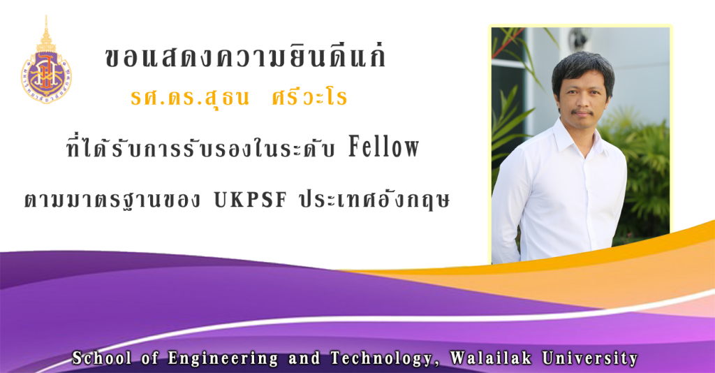 สำนักวิชาวิศวกรรมศาสตร์และเทคโนโลยี ขอแสดงความยินดีกับ รองศาสตราจารย์ ดร. สุธน ศรีวะโร อาจารย์หลักสูตรปิโตรเคมีและพอลิเมอร์ ซึ่งเป็นส่วนหนึ่งในอาจารย์มหาวิทยาลัยวลัยลักษณ์ ที่ผ่านหลักสูตรอบรม UKPSF ซึ่งการได้รับการรับรองในระดับ Fellow ตามมาตรฐานของ The United Kingdom Professional Standards Framework (UKPSF) ประเทศอังกฤษ เป็นระบบการจัดการเรียนการสอนที่ได้มาตรฐานสากลและเป็นที่นิยมใช้กันโดยทั่วไปทั้งนี้กรอบมาตรฐานวิชาชีพระดับอุดมศึกษา UKPSF ได้ถูกพัฒนาโดย The Higher Education Academy (HEA) หรือ Advance HE ในปัจจุบัน ซึ่งเป็นหน่วยงานอิสระระดับชาติในสหราชอาณาจักร เป็นกรอบที่มหาวิทยาลัยวลัยลักษณ์นำมาใช้เพื่อพัฒนาคุณภาพของอาจารย์ให้เป็นคณาจารย์มืออาชีพและมีการจัดการเรียนการสอนอย่างมีคุณภาพได้มาตรฐานสากล