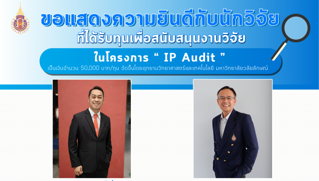 สำนักวิชาวิศวกรรมศาสตร์และเทคโนโลยี ขอแสดงความยินดีกับนักวิจัยที่ได้รับทุนเพื่อสนับสนุนงานวิจัยในโครงการ “IP Audit รอบที่2” ซึ่งจัดโดยฝ่ายบริหารจัดการทรัพย์สินทางปัญญาและถ่ายทอดเทคโนโลยี อุทยานวิทยาศาสตร์และเทคโนโลยี มหาวิทยาลัยวลัยลักษณ์ ได้รับทุนเพื่อสนับสนุนงานวิจัยในโครงการ “IP Audit รอบที่2” เป็นเงินจำนวน 50,000 บาทต่อทุน เพื่อเป็นการยกระดับและต่อยอดงานวิจัยให้สามารถนำไปใช้ในเชิงพานิชย์ได้