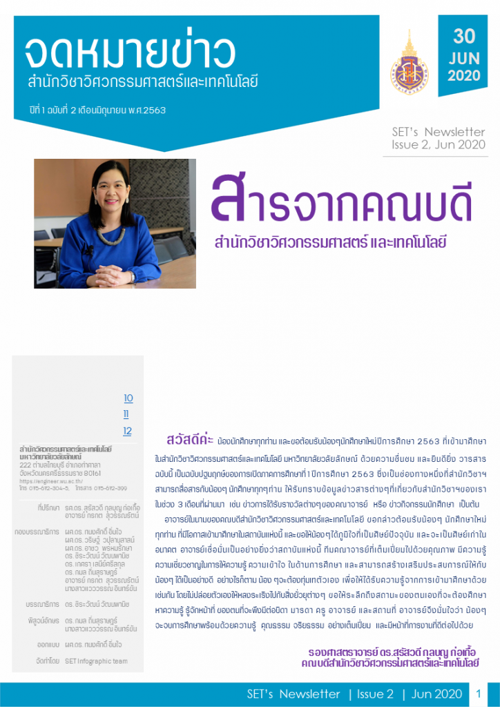 จดหมายข่าว (Newsletter) ฉบับที่ 2 ของสำนักวิชาวิศวกรรมศาสตร์และเทคโนโลยีฉบับนี้ เป็นฉบับที่รายงานข่าวสารต่างๆของสำนักวิชาในช่วงสามเดือนที่ผ่านมาซึ่งมีสถานการณ์แพร่ระบาดของเชื้อไวรัสโควิด – 19 ตั้งแต่เดือนเมษายน ถึง มิถุนายน 2563 และจดหมายข่าวฉบับนี้ยังเป็นฉบับต้อนรับการเปิดภาคการศึกษาใหม่ที่จะมาถึงนี้ในวันที่ 13 กรกฏาคม 2563 ซึ่งตรงกับช่วงมาตรการการผ่อนคลายการล็อกดาวน์ ระยะที่ 5 ของรัฐบาล ทำให้การเรียนการสอน สามารถดำเนินการได้ใกล้เคียงกับสถานการณ์ปกติมากขึ้นมาก