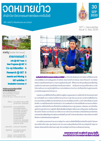จดหมายข่าว (Newsletter) ฉบับที่ 3 ของสำนักวิชาวิศวกรรมศาสตร์และเทคโนโลยีฉบับนี้ เป็นฉบับที่รายงานข่าวสารต่าง ๆ ของสำนักวิชาในช่วงสามเดือนที่ผ่านมาตั้งแต่ เดือนกรกฎาคม ถึง กันยายน 2563 และจดหมายข่าวฉบับนี้ก็อยากจะเป็นส่วนหนึ่งในการแสดงความยินดีกับบัณฑิตประจำปีการศึกษาที่ 2562 เนื่องในโอกาสการรับพระราชทานปริญญาบัตรในวันที่ 25 กันยายน 2563