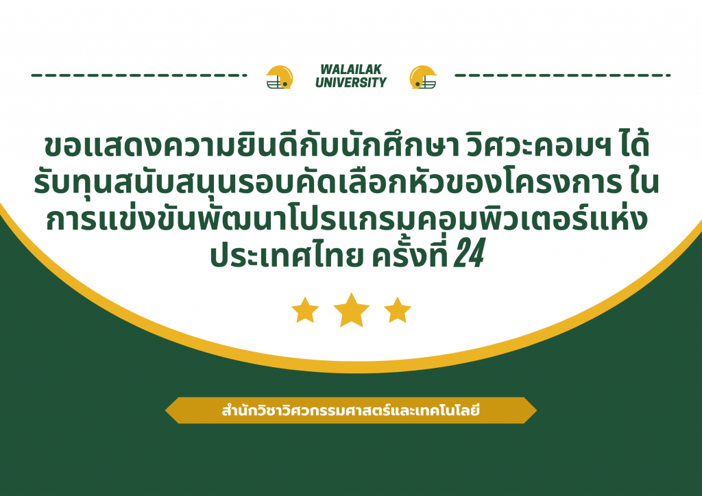 สำนักวิชาวิศวกรรมศาสตร์และเทคโนโลยี ขอแสดงความยินดีกับนักศึกษาสาขาวิชาวิศวกรรมคอมพิวเตอร์และอิเล็กทรอนิกส์ ที่ได้รับทุนสนับสนุนรอบคัดเลือกหัวของโครงการ ในการแข่งขันพัฒนาโปรแกรมคอมพิวเตอร์แห่งประเทศไทย ครั้งที่ 24 โดยมีอาจารย์ที่ปรึกษาโครงการ คือ อาจารย์ ดร. ชิระวัฒน์ วัฒนพานิช