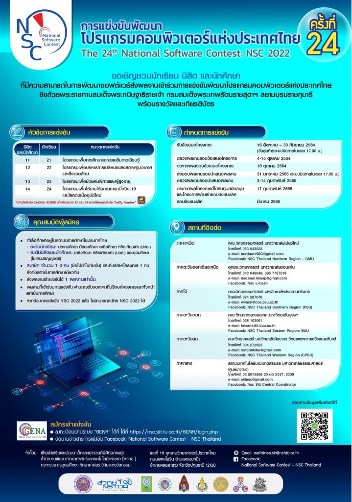 โครงการ “การแข่งขันพัฒนาโปรแกรมคอมพิวเตอร์แห่งประเทศไทย” เป็นโครงการที่สำนักงานพัฒนาวิทยาศาสตร์และเทคโนโลยี (สวทช.) ดำเนินการเพื่อ เป็นเวทีสำหรับนักเรียน นิสิตและนักศึกษาจากทั่วประเทศที่สนใจการพัฒนา ซอฟต์แวร์ส่งโครงการที่พัฒนาด้วยตนเองเข้าร่วมการแข่งขัน โดย สวทช. ได้รับความ ร่วมมือจากมหาวิทยาลัยต่างๆ ในภูมิภาคเพื่อเป็นศูนย์ประสานงานการแข่งขันใน ระดับภูมิภาค ซึ่งปัจจุบันได้ดำเนินการแข่งขันในครั้งที่ 24 (NSC2022)