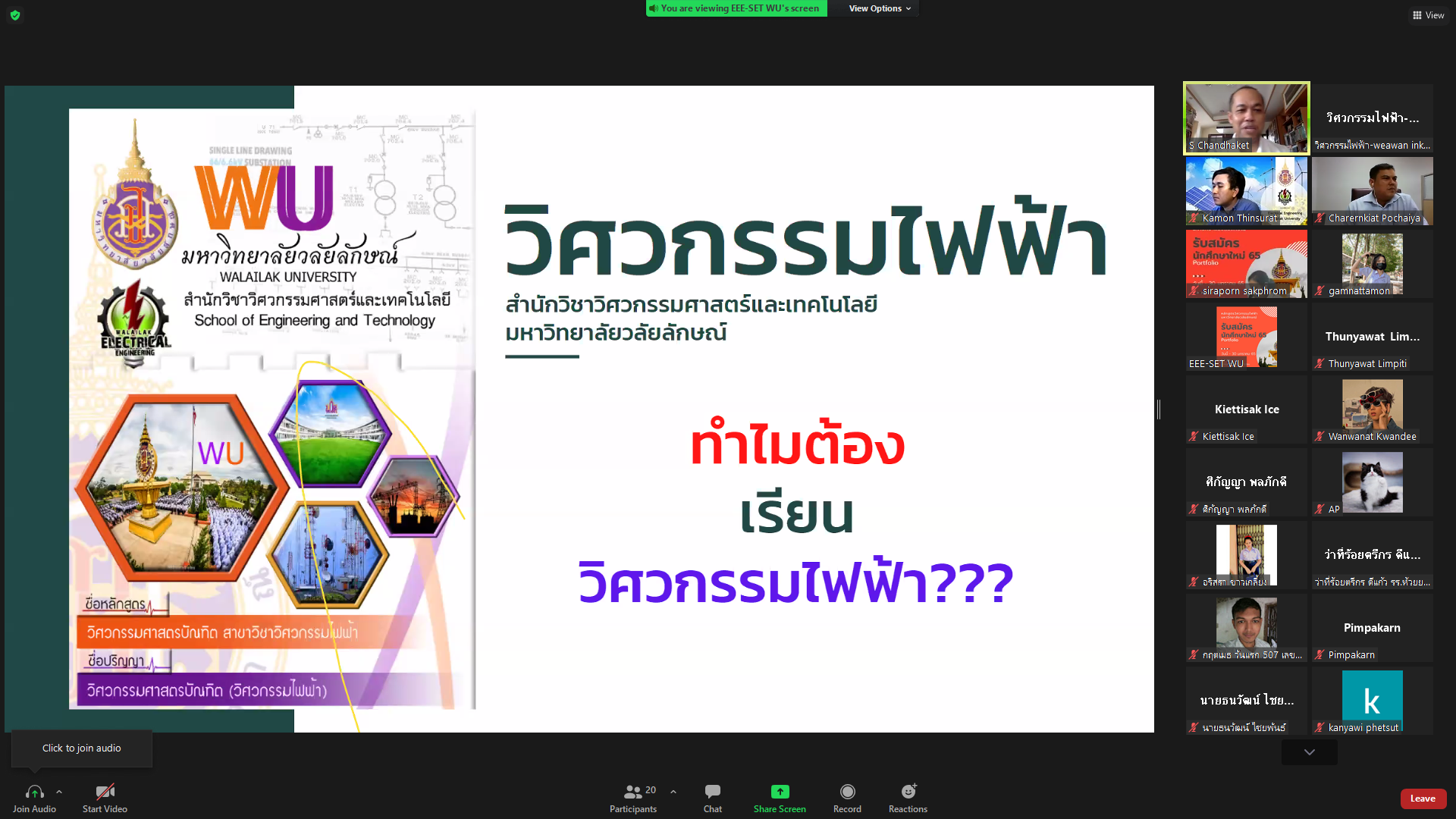 วันอังคาร ที่ 16 พฤศจิกายน 2564 คณาจารย์ หลักสูตรวิศวกรรมไฟฟ้า สำนักวิชาวิศวกรรมศาสตร์และเทคโนโลยี มหาวิทยาลัยวลัยลักษณ์ ประชาสัมพันธ์หลักสูตร โรงเรียนสตรีพัทลุง จังหวัดพัทลุง โดยกิจกรรมจัดอยู่ในรูปแบบออนไลน์ ZOOM ซึ่งมีนักเรียนเข้าร่วมกิจกรรมในครั้งนี้จำนวนมาก โดยเป็นนักเรียนชั้นมัธยมศึกษาที่ 6 สายวิทย์-คณิต เพื่อให้นักเรียนที่กำลังศึกษาชั้นมัธยมตอนปลายทราบถึงข้อมูลระบบการคัดเลือกบุคคลเข้าศึกษาในสถาบันอุดมศึกษา ระบบ TCAS ประจำปีการศึกษา 2565