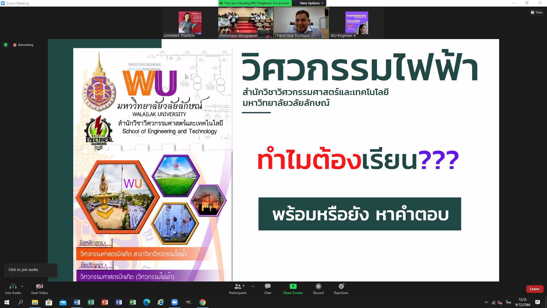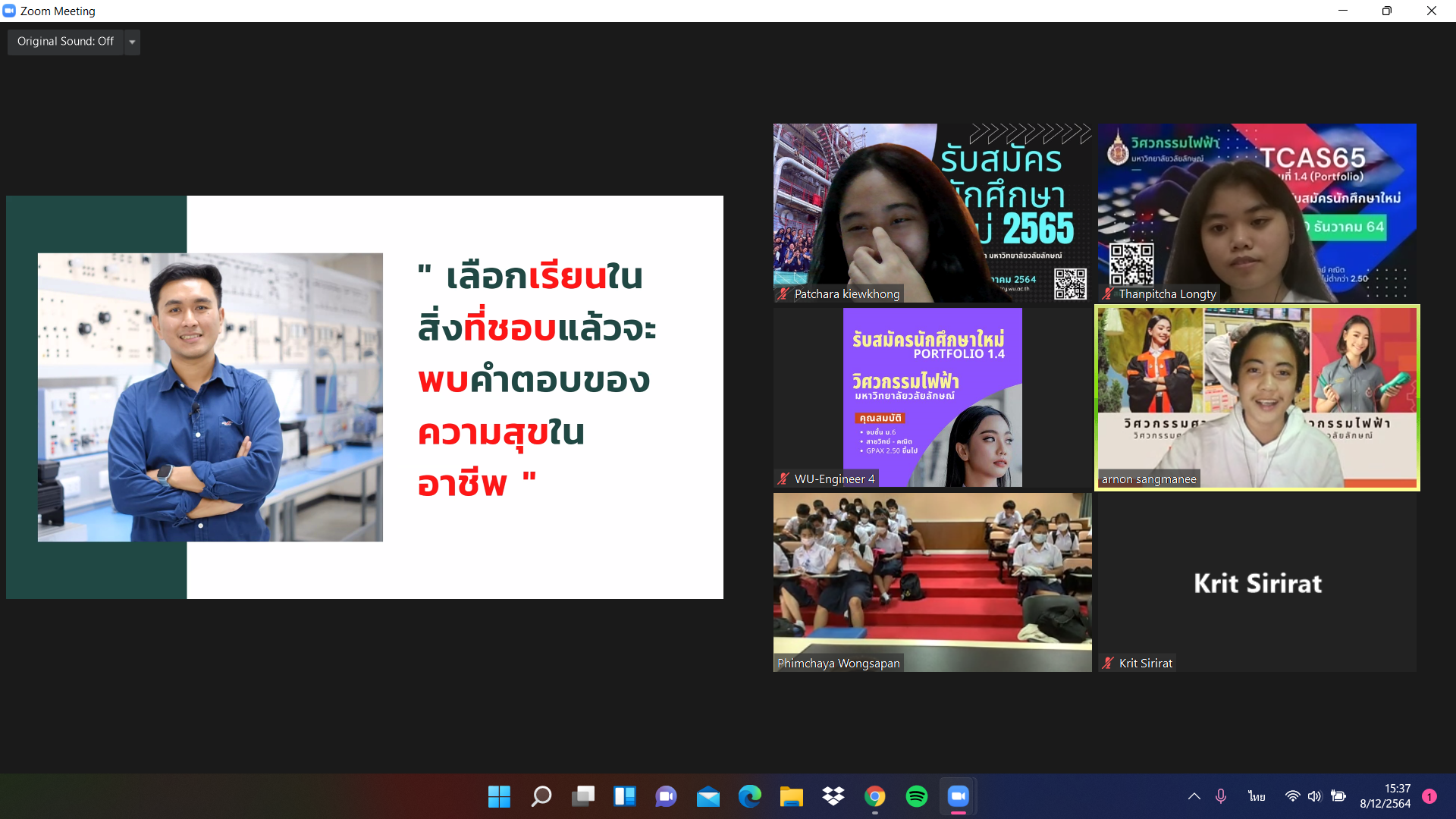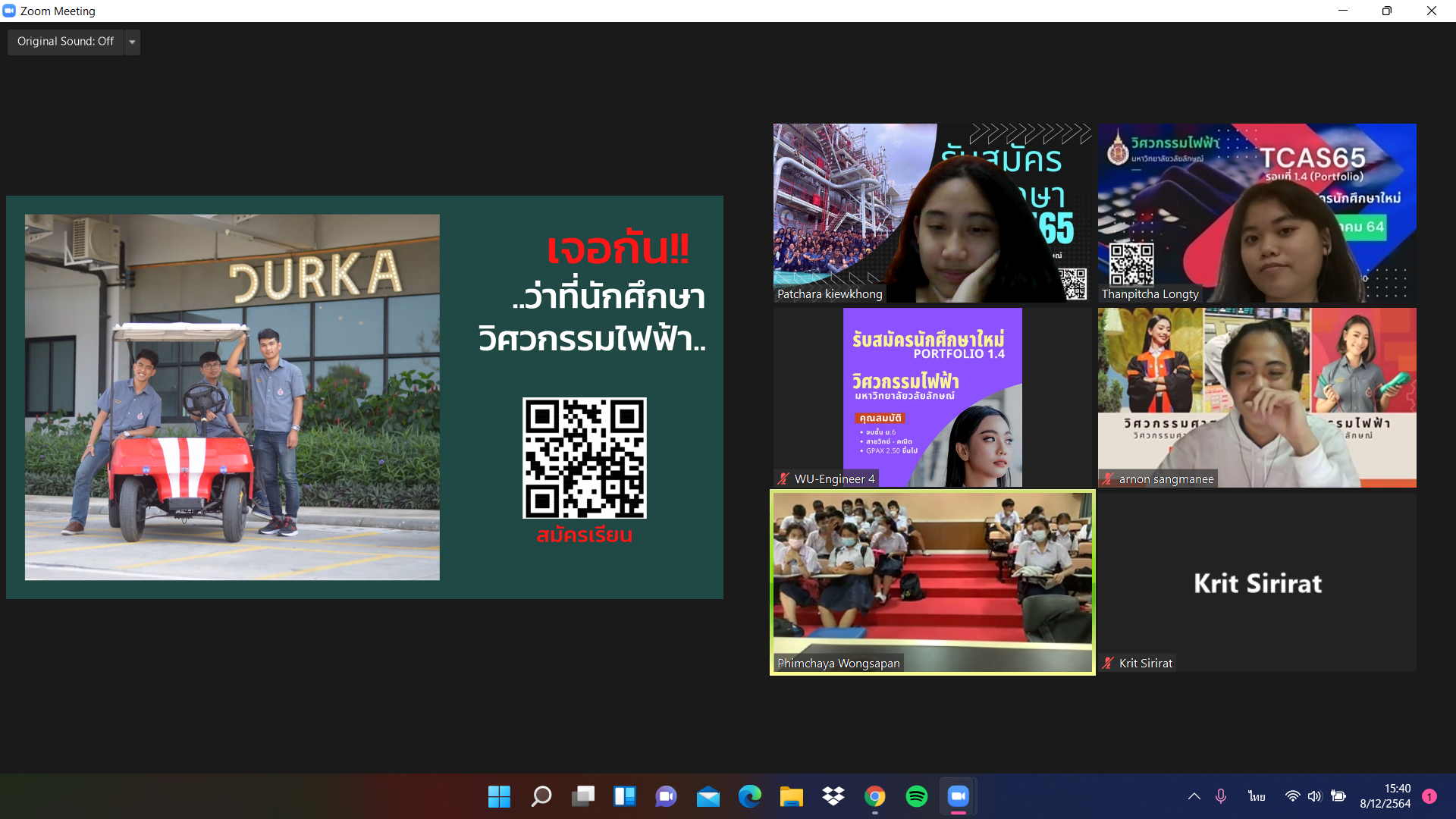 เมื่อวันที่ 8-9 ธันวาคม 2564 คณาจารย์หลักสูตรวิศวกรรมไฟฟ้า สำนักวิชาวิศวกรรมศาสตร์และเทคโนโลยี มหาวิทยาลัยวลัยลักษณ์ ประชาสัมพันธ์หลักสูตร โรงเรียนเฉลิมพระเกียรติสมเด็จพระศรีนครินทร์ ภูเก็ต จังหวัดภูเก็ต โดยกิจกรรมจัดอยู่ในรูปแบบออนไลน์ ZOOM ซึ่งมีนักเรียนเข้าร่วมกิจกรรมในครั้งนี้จำนวนมาก โดยเป็นนักเรียนชั้นมัธยมศึกษาที่ 6 สายวิทย์-คณิต จำนวน 4 ห้อง เพื่อให้นักเรียนที่กำลังศึกษาชั้นมัธยมตอนปลายทราบถึงข้อมูลระบบการคัดเลือกบุคคลเข้าศึกษาในสถาบันอุดมศึกษา ระบบ TCAS ประจำปีการศึกษา 2565