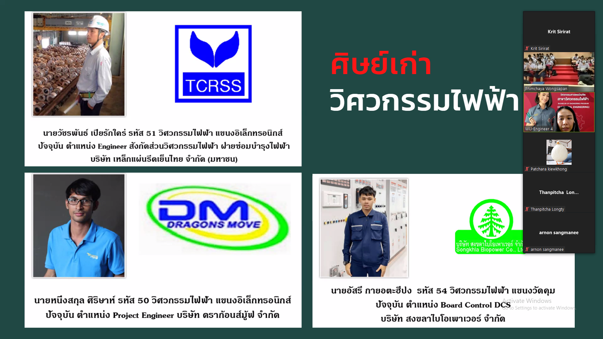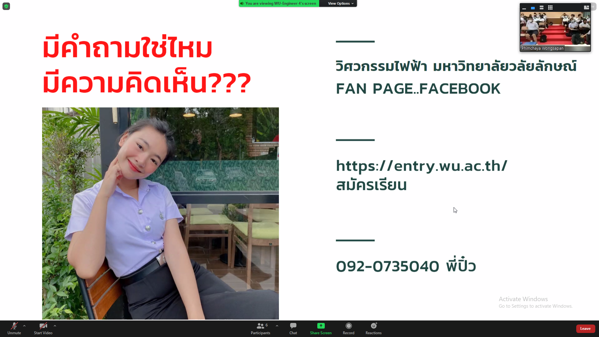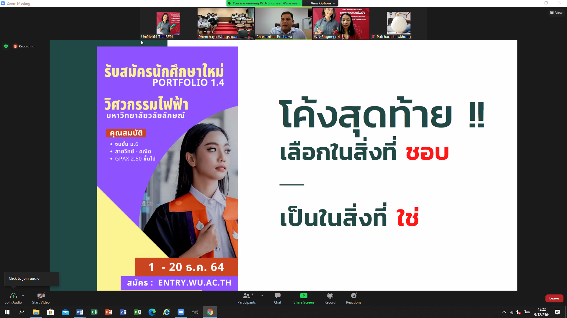 เมื่อวันที่ 8-9 ธันวาคม 2564 คณาจารย์หลักสูตรวิศวกรรมไฟฟ้า สำนักวิชาวิศวกรรมศาสตร์และเทคโนโลยี มหาวิทยาลัยวลัยลักษณ์ ประชาสัมพันธ์หลักสูตร โรงเรียนเฉลิมพระเกียรติสมเด็จพระศรีนครินทร์ ภูเก็ต จังหวัดภูเก็ต โดยกิจกรรมจัดอยู่ในรูปแบบออนไลน์ ZOOM ซึ่งมีนักเรียนเข้าร่วมกิจกรรมในครั้งนี้จำนวนมาก โดยเป็นนักเรียนชั้นมัธยมศึกษาที่ 6 สายวิทย์-คณิต จำนวน 4 ห้อง เพื่อให้นักเรียนที่กำลังศึกษาชั้นมัธยมตอนปลายทราบถึงข้อมูลระบบการคัดเลือกบุคคลเข้าศึกษาในสถาบันอุดมศึกษา ระบบ TCAS ประจำปีการศึกษา 2565