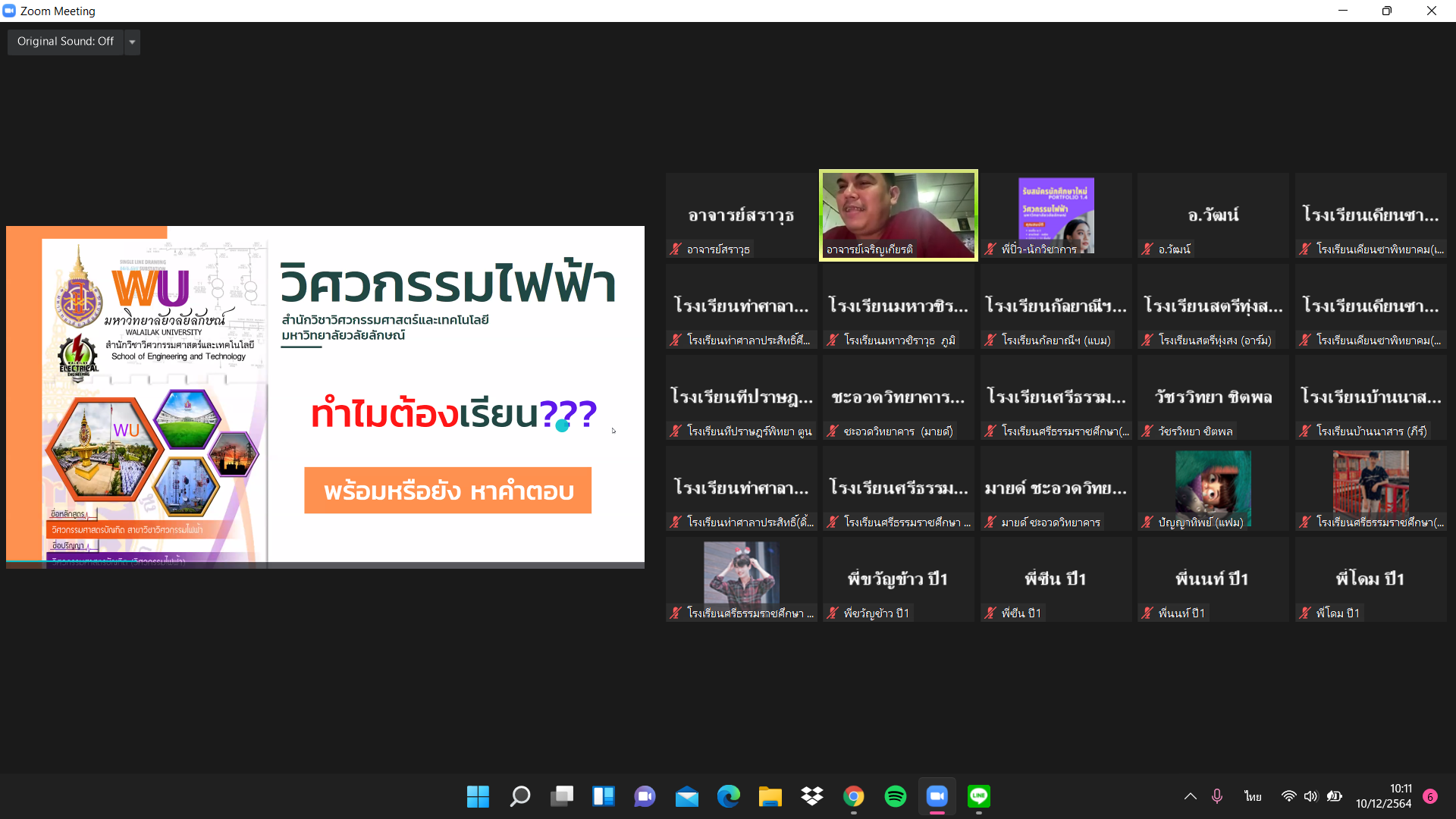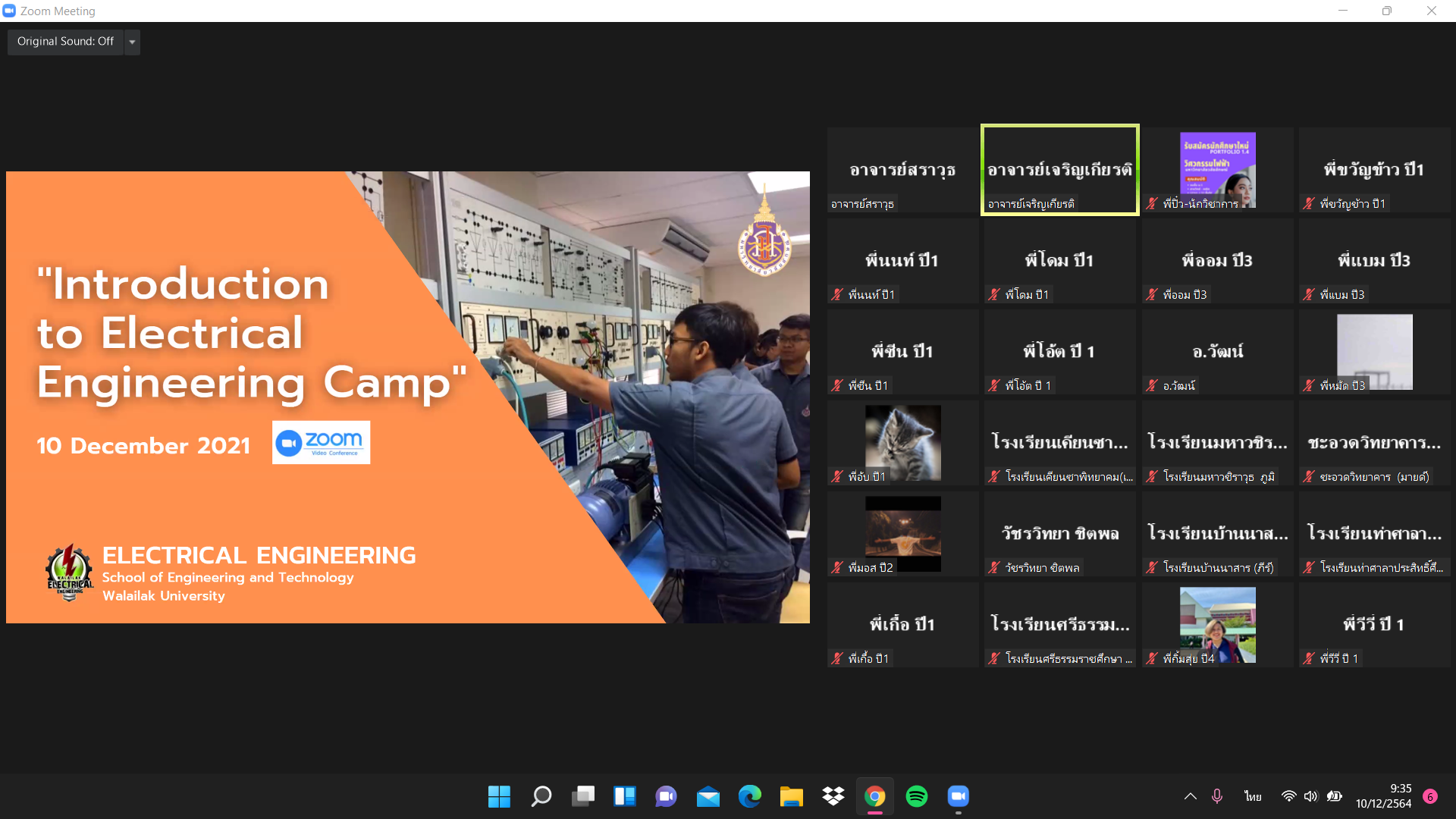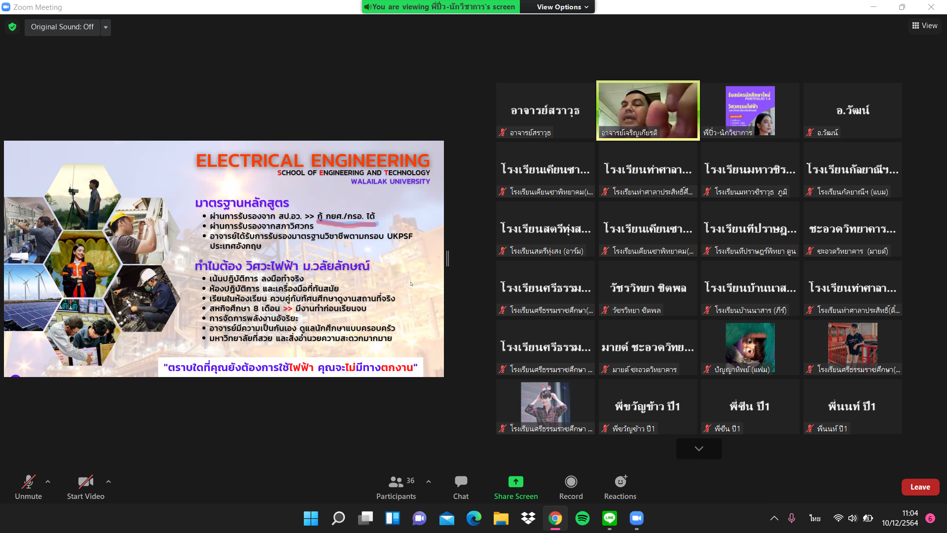 ในวันที่ 10 ธันวาคม 2564 คณาจารย์หลักสูตรวิศวกรรมไฟฟ้า สำนักวิชาวิศวกรรมศาสตร์และเทคโนโลยี มหาวิทยาลัยวลัยลักษณ์ จัดกิจกรรมแนะนำหลักสูตรให้แก่น้องๆมัธยมศึกษาชั้นปีที่ 6 ที่ผ่านการคัดเลือกให้ศึกษาต่อในระดับปริญญาตรี หลักสูตรวิศวกรรมไฟฟ้า มหาวิทยาลัยวลัยลักษณ์ในรอบ Portfolio ประจำปีการศึกษา 2565 โดยกิจกรรมจัดอยู่ในรูปแบบออนไลน์ ZOOM ซึ่งมีนักเรียนเข้าร่วมกิจกรรมในครั้งนี้จำนวนมาก โดยเป็นนักเรียนชั้นมัธยมศึกษาที่ 6 ที่ผ่านการคัดเลือกให้ศึกษาต่อได้ทราบข้อมูลของหลักสูตรอย่างละเอียด เช่น แผนการศึกษา แนะนำสิ่งอำนวยความสะดวกและการใช้ชีวิตในรั้วมหาวิทยาลัย ทำความรู้จักกับรุ่นพี่ เป็นต้น เพื่อเตรียมความพร้อมก่อนเข้าศึกษาต่อ โดยมีคณาจารย์ รุ่นพี่ทั้ง 4 ชั้นปีมาต้อนรับ พูดคุยแชร์ประสบการณ์ต่างๆ