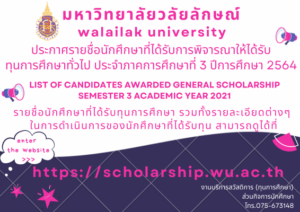 สำนักวิชาวิศวกรรมศาสตร์และเทคโนโลยี มหาวิทยาลัยวลัยลักษณ์ ขอแสดงความยินดีกับนักศึกษาที่ได้รับการจัดสรรทุนการศึกษา ของมหาวิทยาลัยวลัยลักษณ์ โดยงานบริการสวัสดิการ (ทุนการศึกษา) ส่วนกิจการนักศึกษา ได้พิจารณาจัดสรรทุนการศึกษาทั่วไป ประจำภาคการศึกษาที่ 3/2564 โดยทุนการศึกษาทั้งหมด เป็นทุนการศึกษาที่ได้รับการอนุเคราะห์จากจากบุคคลภายนอก คณาจารย์ ศิษย์เก่า รวมทั้งบุคลากรของมหาวิทยาลัย เพื่อช่วยเหลือนักศึกษาและครอบครัวที่ขาดแคลน มีความจำเป็นและเดือดร้อนในเรื่องทุนทรัพย์ โดยได้จัดสรรทุนการศึกษาให้กับนักศึกษาจำนวน 52 คน รวมเงินทุนการศึกษาทั้งสิ้นจำนวน 220,000 บาท ทั้งหมดจำนวน 24 แหล่งทุน โดยนักศึกษาสำนักวิชาวิศวกรรมศาสตร์และเทคโนโลยี ได้รับทุนการศึกษาทั้งหมดจำนวน 6 คน ดังนี้