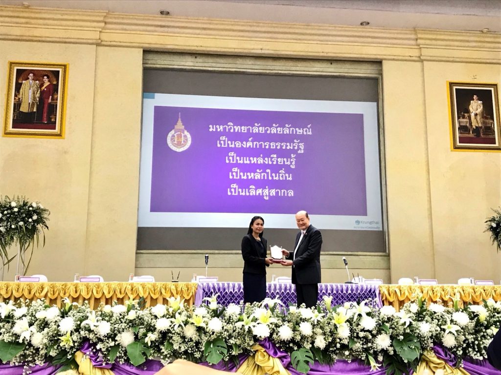 อาจารย์จันทิรา รัตนรัตน์ สำนักวิชาวิศวกรรมศาสตร์และทรัพยากร ได้รับรางวัลดีเด่นด้านบริการวิชาการ ประจำปีงบ 2560 เข้ารับมอบโล่ประกาศเกียรติคุณจากนายกสภามหาวิทยาลัย (ศาสตราจารย์ ดร.วิจิตร ศรีสอ้าน) ในวันที่ 29 มีนาคม 2561 (วันสถาปนามหาวิทยาลัยครบรอบ 26 ปี)