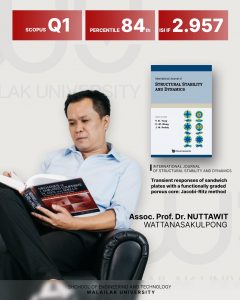 3. รศ.ดร.ณัฐวิทย์ วัฒนสกุลพงศ์ และ อาจารย์ ดร.ศุภกิจ เอียดตรง สาขาวิชาวิศวกรรมเครื่องกลและหุ่นยนต์ วารสาร International Journal of Structural Stability and Dynamics, Q1 ซึ่งมีค่าเปอร์เซ็นต์ไทล์ที่ 84 และค่า ISI Impact factor 2.957