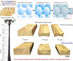 “สำหรับกระบวนการ Pre-treatment ประกอบด้วยการอัดน้ำเข้าไปในไม้ปาล์มน้ำมัน ต่อด้วยการแช่เยือกแข็งที่อุณหภูมิต่ำกว่า 10 องศาเซลเซียส ซึ่งจะทำให้เกิดรอยแตกขนาดเล็กในระดับ 1 ในล้านของเมตรในโครงสร้างไม้ปาล์มน้ำมัน ส่งผลให้ปาล์มน้ำมันสามารถอบได้อย่างรวดเร็ว ด้วยกระบวนการอบที่รุนแรง สามารถอบไม้ที่มีความหนามากๆได้ สามารถทำกระบวนการ Heat-treatment ด้วยความร้อนตั้งแต่เริ่มต้นที่อุณหภูมิสูงมากถึง 200 องศาเซลเซียสได้” รองศาสตราจารย์ ดร.นิรันดร กล่าว