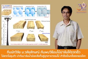 ทีมนักวิจัยของศูนย์ความเป็นเลิศด้านไม้และวัสดุชีวภาพ ม.วลัยลักษณ์ ค้นพบกระบวนการ Pre-treatment เพื่อการอบไม้ปาล์มน้ำมันได้อย่างรวดเร็วโดยไม่แตกและไม่ยุบตัว ช่วยแก้ปัญหาการอบไม้ปาล์มน้ำมันที่มีมานานในอุตสาหกรรมกว่า 20 ปี สำเร็จเป็นครั้งแรกของโลก พร้อมยื่นจดทรัพย์สินทางปัญญาแล้วใน 3 ประเทศ