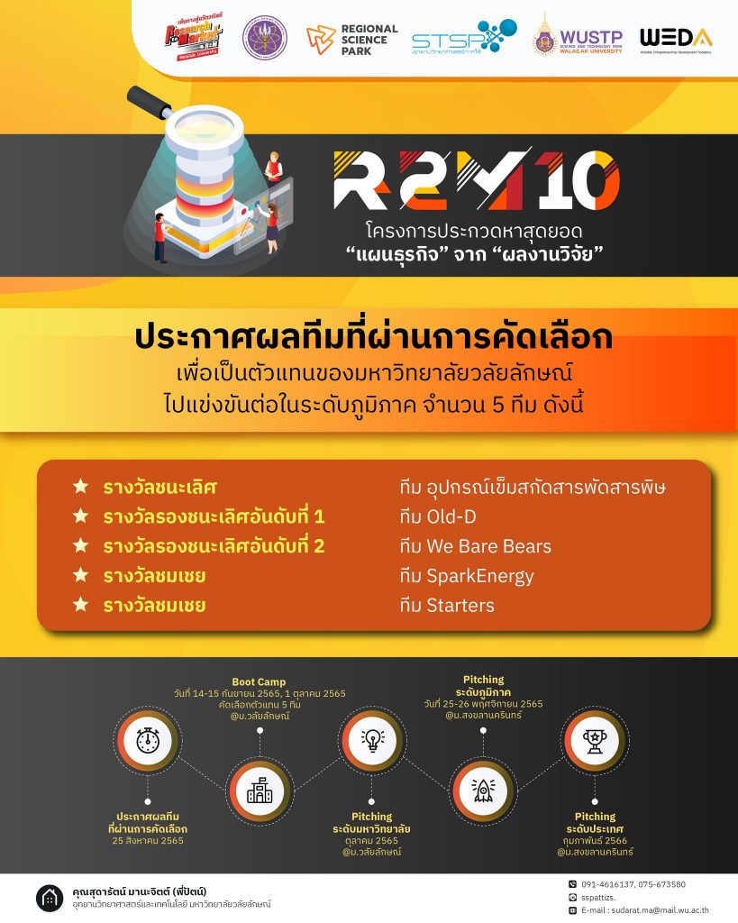 วันที่ 10 ตุลาคม 2565 สำนักวิชาวิศวกรรมศาสตร์และเทคโนโลยี มหาวิทยาลัยวลัยลักษณ์ ขอแสดงความยินดีกับนักศึกษาหลักสูตรวิศวกรรมไฟฟ้า หลักสูตรปิโตรเคมีและพอลิเมอร์ และหลักสูตรวิศวกรรมเคมีและเภสัชกรรม ที่ได้เข้ารอบ 5 ทีมสุดท้ายเพื่อเป็นตัวแทนของมหาวิทยาลัยวลัยลักษณ์ไปแข่งขันต่อในรอบระดับภูมิภาคในกิจกรรม Pitching Day นำเสนอแผนธุรกิจจากผลงานวิจัย เฟ้นหา 5 ทีมสุดท้ายเพื่อเป็นตัวแทนของมหาวิทยาลัยวลัยลักษณ์ไปแข่งขันต่อในรอบระดับภูมิภาค