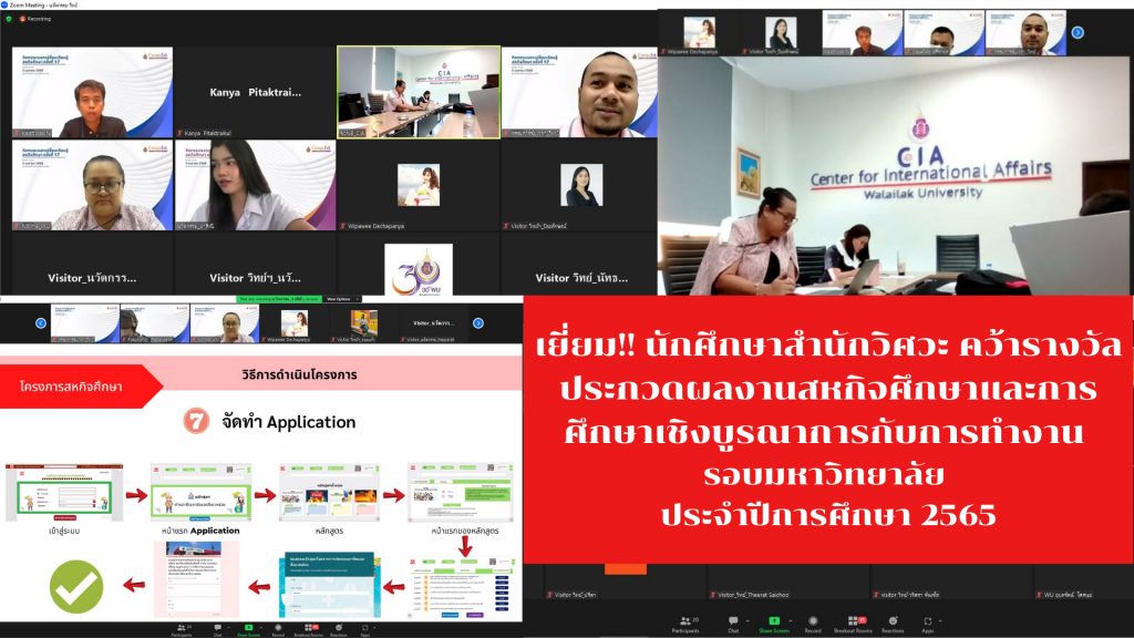 เมื่อวันที่ 5 เมษายน 2566 ศูนย์สหกิจศึกษาและพัฒนาอาชีพ มหาวิทยาลัยวลัยลักษณ์ จัดการประกวดผลงานสหกิจศึกษาและการศึกษาเชิงบูรณาการกับการทำงาน รอบมหาวิทยาลัย ประจำปีการศึกษา 2565 ณ อาคารสหกิจศึกษา มหาวิทยาลัยวลัยลักษณ์ จังหวัดนครศรีธรรมราช และผ่านระบบออนไลน์โปรแกรม Zoom Cloud Meetings โดยได้รับเกียรติจากคณาจารย์จากสำนักวิชาต่างๆ ร่วมเป็นคณะกรรมการตัดสิน มีนักศึกษาเข้าร่วมทั้งสิ้น 21 คน จาก 8 สำนักวิชาประกอบด้วย 1. สำนักวิชาวิศวกรรมศาสตร์และเทคโนโลยี 2. สำนักวิชาสารสนเทศศาสตร์ 3. สำนักวิชาสาธารณสุขศาสตร์ 4.สำนักวิชาเทคโนโลยีการเกษตรและอุตสาหกรรมอาหาร 5. สำนักวิชาการจัดการ 6. สำนักวิชาศิลปศาสตร์ 7.สำนักวิชาการบัญชีและการเงิน