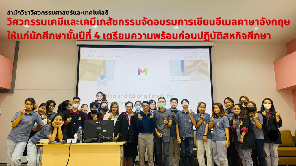 สาขาวิชาวิศวกรรมเคมีและเคมีเภสัชกรรม สำนักวิชาวิศวกรรมศาตร์และเทคโนโลยี จัดกิจกรรมอบรมเชิงปฏิบัติการการเขียนอีเมลภาษาอังกฤษ ให้กับนักศึกษาชั้นปีที่ 4 เมื่อวันที่ 12 กรกฎาคม 2566 เวลา 13.00-15.30 น. ณ ห้องประชุม 124 อาคารวิชาการ 4