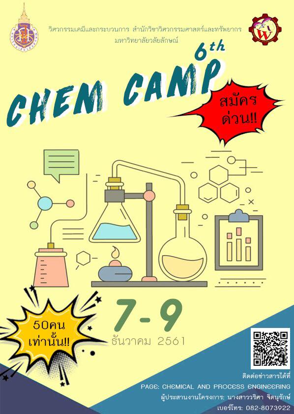 หลักสูตรวิศวกรรมเคมีและกระบวนการ สำนักวิชาวิศวกรรมศาสตร์และทรัพยากร จัดค่าย chem camp ครั้งที่ 6 ในช่วงวันที่ 7 – 9 ธันวาคม 2561 จำนวน 50 ท่านเท่านั้น เปิดรับสมัครตั้งแต่วันนี้เป็นต้นไป สนใจติดต่อ นางสาววริศรา จิตนุรักษ์ เบอร์โทรศัพท์ 082-807-3922