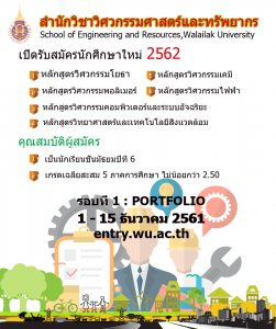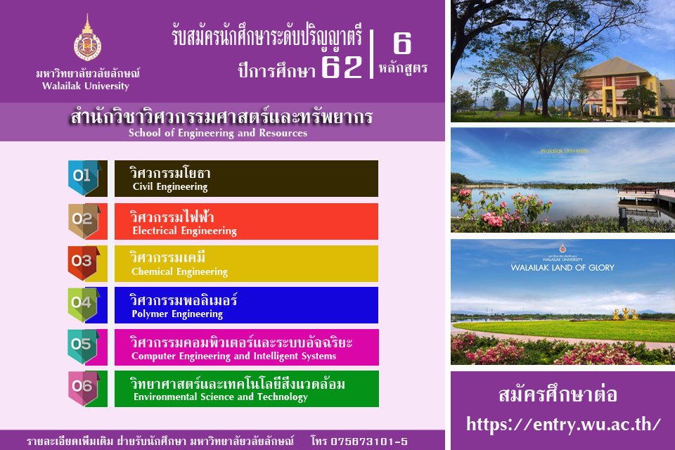 สนใจสมัครได้ที่ http://entry.wu.ac.th หรือสอบถามเพิ่มเติมได้ที่ 075-673-101-5 หรือ Facebook : School of Engineering and Resources, Walailak University