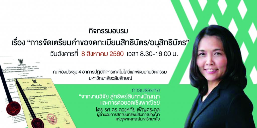 มหาวิทยาลัยวลัยลักษณ์ จึงได้จัดกิจกรรมเพื่อเป็นการให้ความรู้ ส่งเสริมและกระตุ้นให้เกิดการขอรับความคุ้มครองสิทธิบัตร/อนุสิทธิบัตรอันเป็นสิ่งดีและควรให้ความสำคัญก่อนจะนำไปสู่การนำผลงานวิจัยนั้นไปใช้ประโยชน์ในเชิงพาณิชย์ วิทยากรผู้เชี่ยวชาญด้านสิทธิบัตรโดย รศ.ดร.ดวงหทัย เพ็ญตระกูล ผู้อำนวยการสถาบันทรัพย์สินทางปัญญาแห่งจุฬาลงกรณ์มหาวิทยาลัย จึงขอเชิญนักศึกษา บุคลากรตลอดจนผู้ที่สนใจทุกท่านเข้าร่วมอบรม เรื่อง “การจัดเตรียมคำขอจดทะเบียนสิทธิบัตร/อนุสิทธิบัตร”