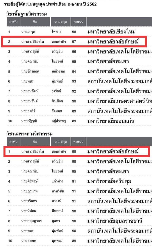ทางสำนักวิชาวิศวกรรมศาสตร์และเทคโนโลยี ขอแสดงความยินดีกับนางสาวสิริอำไพ ชอบทำกิจ ที่มีคะแนนสอบใบประกอบวิชาชีพทางวิศวกรรมเคมี ได้คะแนนสูงสุดประจำเดือน เมษายน 2562 ในรายวิชาเฉพาะทางวิศวกรรม และได้คะแนนอันดับสองในรายวิชาพื้นฐานวิศวกรรม