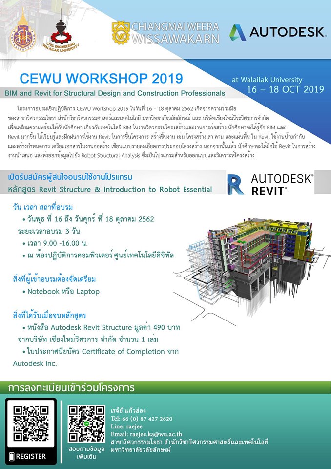 สาขาวิศวกรรมโยธา สำนักวิชาวิศวกรรมศาสตร์และเทคโนโลยี มหาวิทยาลัยวลัยลักษณ์ และ บริษัทเชียงใหม่วีระวิศวการ จำกัด จัดกิจกรรมโครงการอบรมเชิงปฏิบัติการ CEWU Workshop 2019 ในวันที่ 16 – 18 ตุลาคม 2562 ณ มหาวิทยาลัยวลัยลักษณ์ ห้องปฎิบัติการคอมพิวเตอร์ ศูนย์เทคโนโลยีดิจิทัล โดยเกิดจากความร่วมมือ ของสาขาวิศวกรรมโยธา สำนักวิชาวิศวกรรมศาสตร์และเทคโนโลยี มหาวิทยาลัยวลัยลักษณ์ และ บริษัทเชียงใหม่วีระวิศวการ จำกัด เพื่อเตรียมความพร้อมให้กับนักศึกษา เกี่ยวกับเทคโนโลยี BIM ในงานวิศวกรรมโครงสร้างและงานการก่อสร้าง นักศึกษาจะได้รู้จัก BIM และ Revit มากขึ้น ได้เรียนรู้และฝึกฝนการใช้งาน Revit ในการขึ้นโครงการ สร้างชิ้นงาน เช่น โครงสร้างเสา คาน และแผ่นพื้น ใน Revit ใช้งานป้ายกำกับ และสร้างกำหนดการ เตรียมเอกสารในงานก่อสร้าง เขียนแบบรายละเอียดการประกอบโครงสร้าง นอกจากนั้นแล้ว นักศึกษาจะได้ฝึกใช้ Revit ในการสร้าง งานนำเสนอ และส่งออกข้อมูลไปยัง Robot Structural Analysis ซึ่งเป็นโปรแกรมสำหรับออกแบบและวิเคราะห์โครงสร้าง