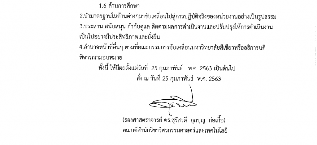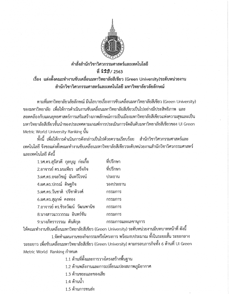 หนังสือแต่งตั้งคณะทำงานทำงานขับเคลื่อนมหาวิทยาลัยสีเขียว (Green University) ระดับหน่วยงาน สำนักวิชาวิศวกรรมศาสตร์และเทคโนโลยี มหาวิทยาลัยวลัยลักษณ์
